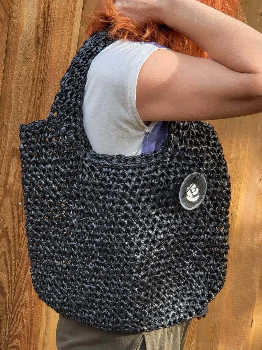 Jade’s unique bags are made from ‘plarn’ (plastic yarn) or discarded clothing which is made from long continuous strips which are then knitted or crocheted into a strong and versatile accessory. Using a similar technique, Jade crafts jewellery from reclaimed plastic bottle lids. How ingenious!